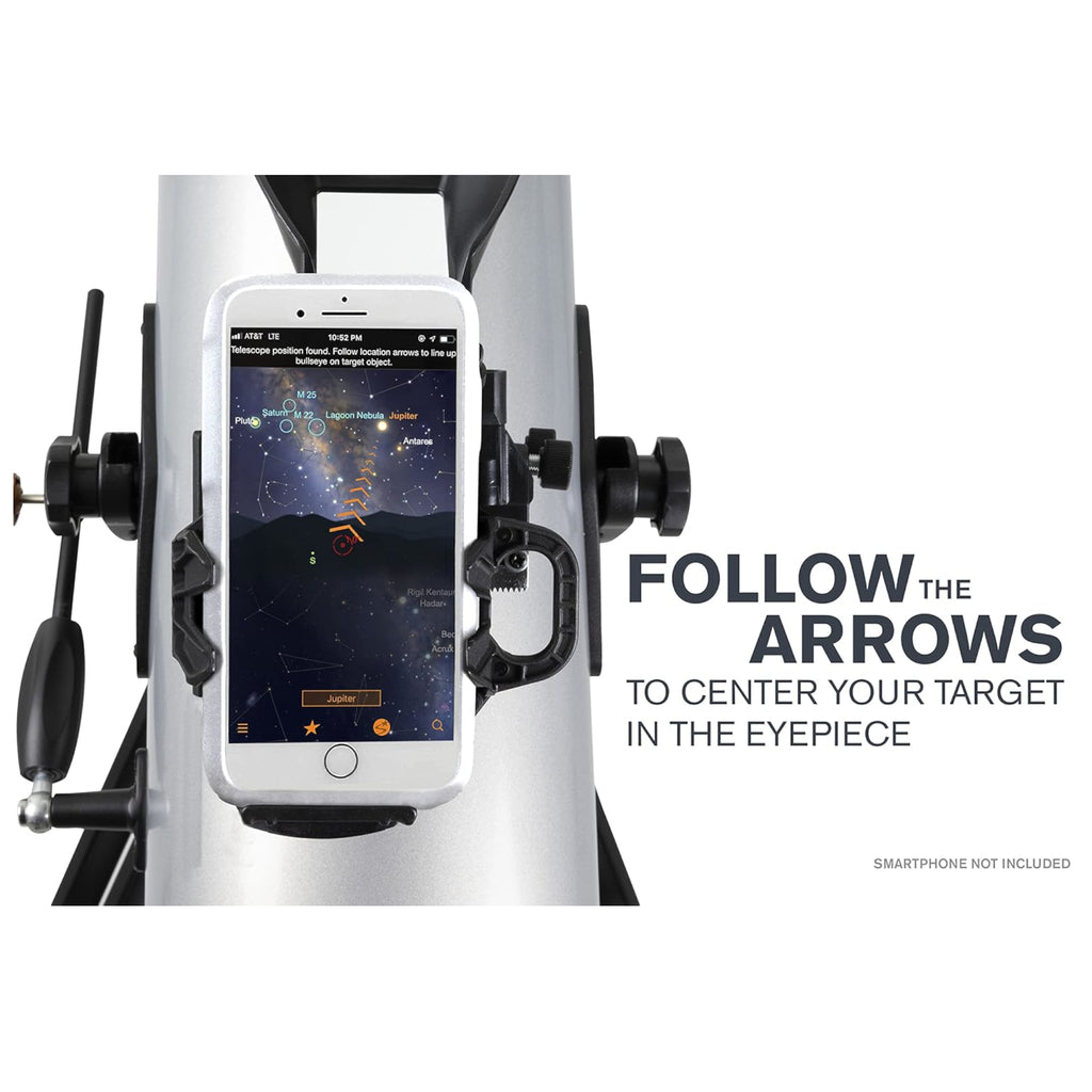The StarSense Explorer system simplifies locating celestial objects. Simply dock your phone, launch the StarSense Explorer app, and align it with the telescope’s optics using a quick two-minute setup. The app then displays arrows to guide telescope movement, and when the bullseye turns green, the object is ready to view in the eyepiece.