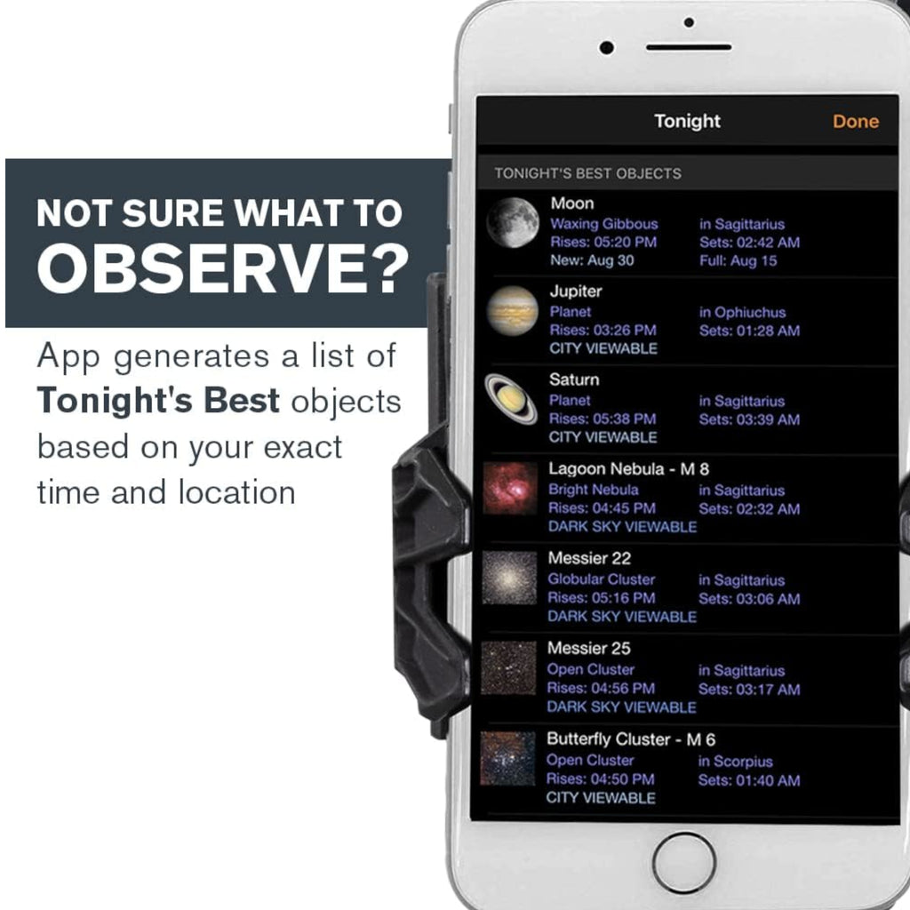 The StarSense Explorer app automatically generates a list of visible celestial objects, allowing you to view planets, brighter nebulae and galaxies, star clusters, and double stars from urban locations, or faint deep-sky objects from darker observing sites.