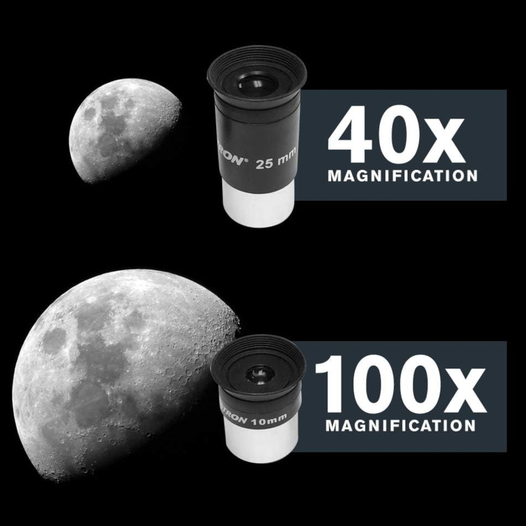 Includes 25mm and 10mm eyepieces plus 2x Barlow lens for expanded magnification options