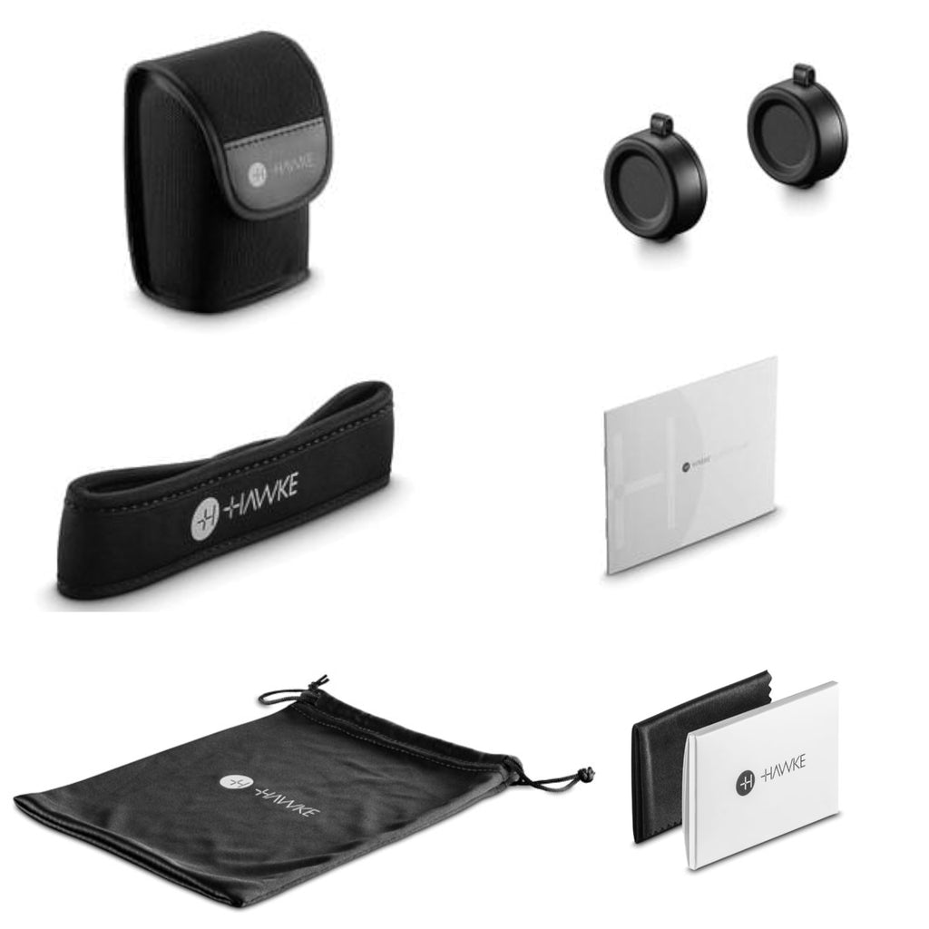 Instruction Manual, lens cloth, protective pouch, neck strap, and objective lens covers are supplied with the Hawke Endurance Ed 10x25 binoculars