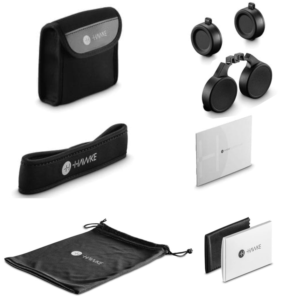Instruction manual, lens cloth, protective pouch, protective carry case, neck strap, objective lens cover, ocular lens cover.